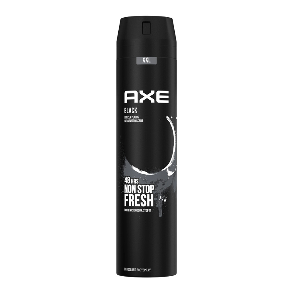 Termék leírás: AXE Black férfi dezodor és testspray, 250 ml, 48 órás frissességet biztosító cédrusfa és fagyasztott körte illattal.