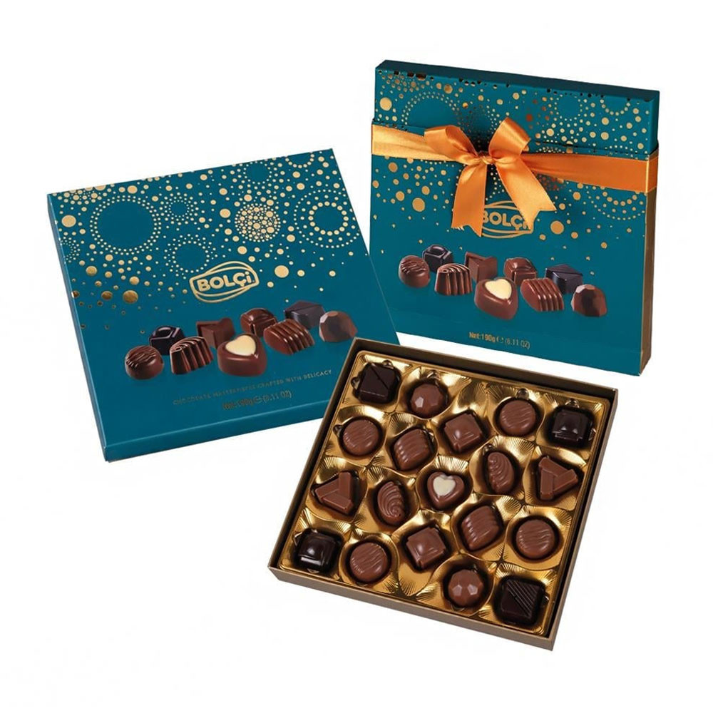 Termék leírás: Bolci Orient Green desszert - 190g. Válogatott tejcsokoládé, étcsokoládé és fehércsokoládé pralinék különféle (mogyorós, pisztáciás, mandulás, krokantos és ganache) töltelékkel, elegáns díszdobozban.
