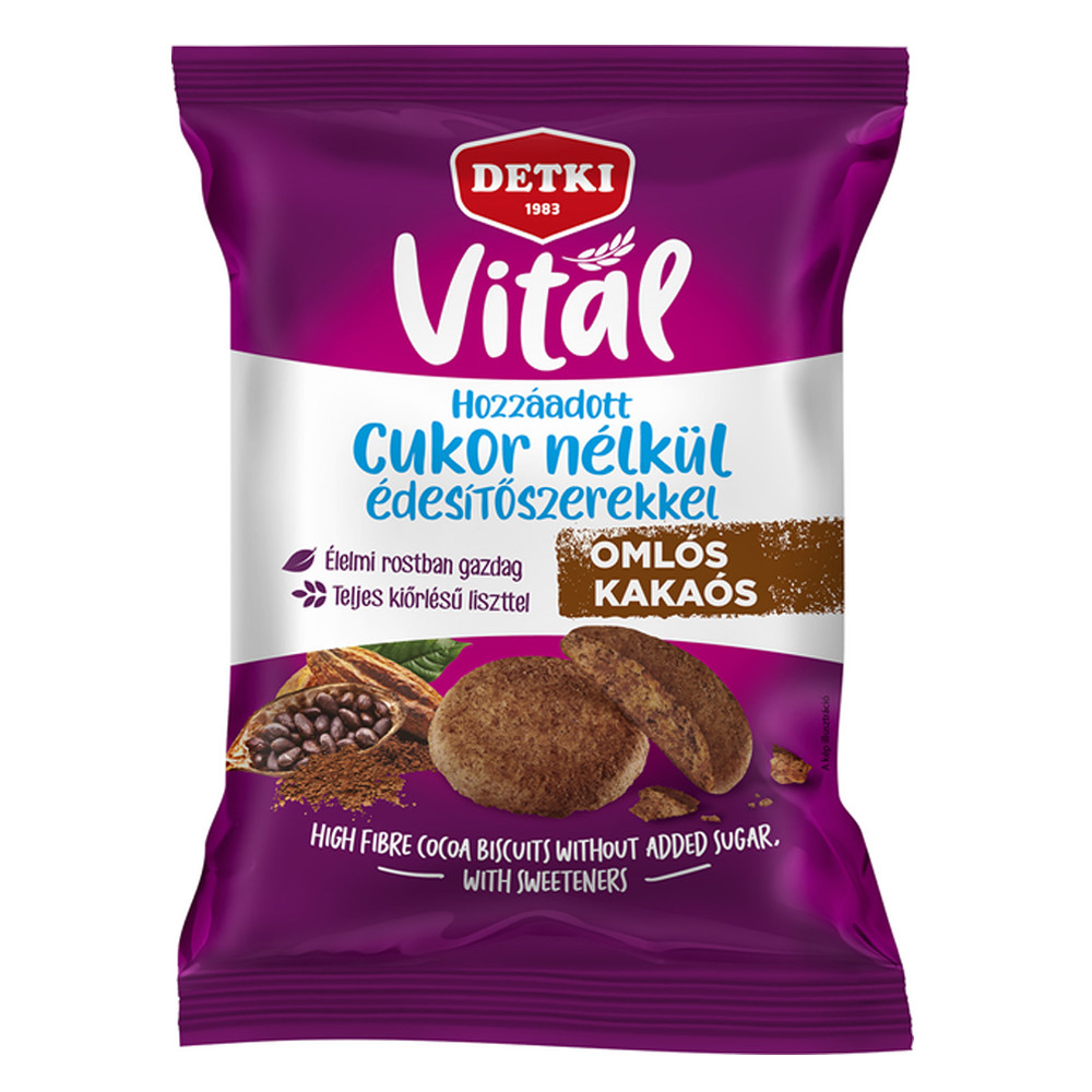 Termék leírás: Detki Vital omlós kakaós keksz, hozzáadott cukor nélkül, élelmi rostban gazdag, teljes kiőrlésű liszttel