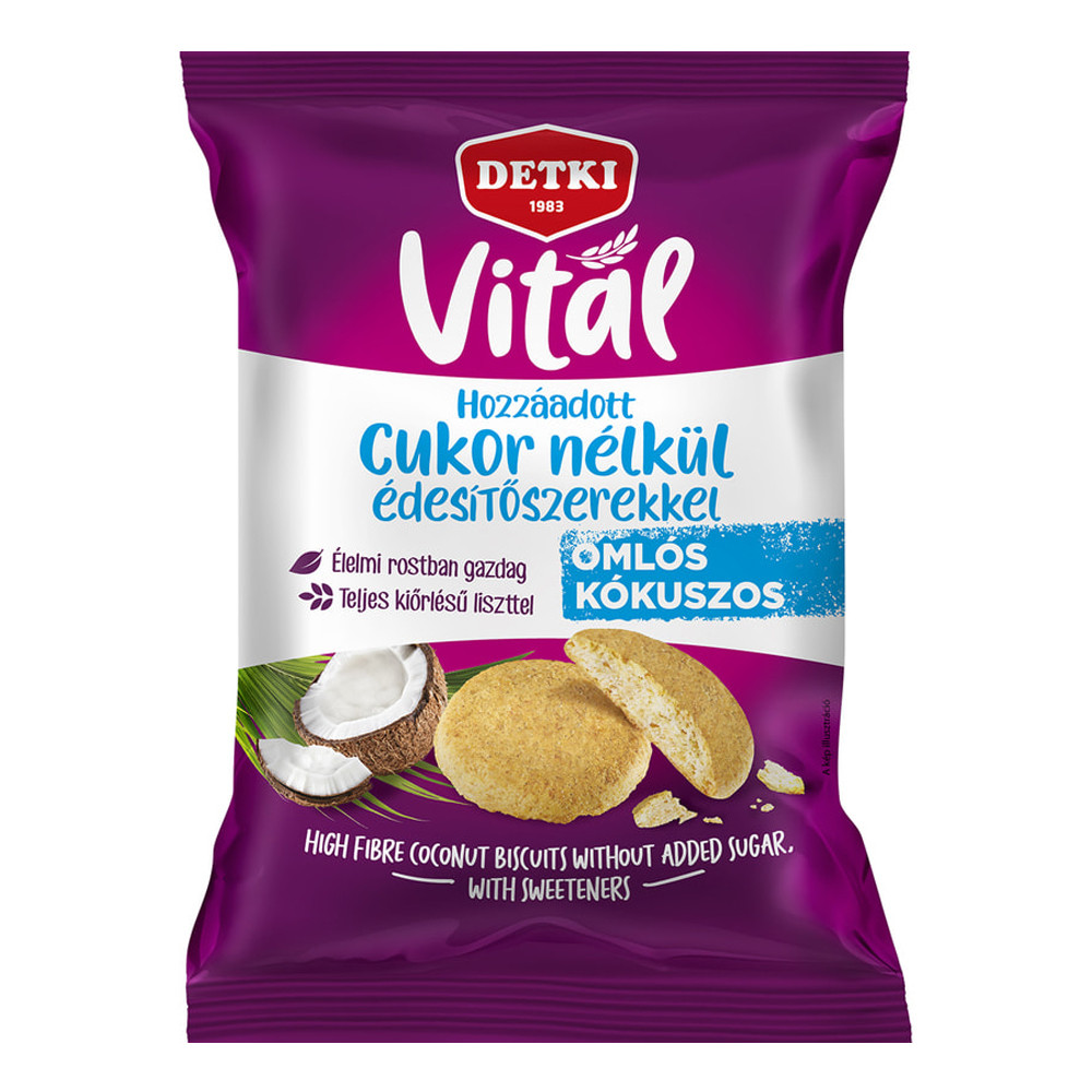 Termék leírás: Detki Vital omlós kókuszos keksz, hozzáadott cukor nélkül, teljes kiőrlésű liszttel és magas rosttartalommal.