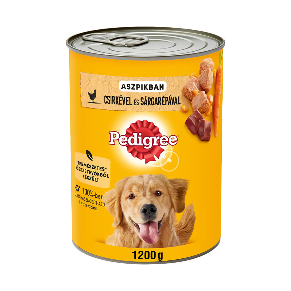 Termék leírás: Pedigree teljes értékű nedves állateledel felnőtt kutyák számára, csirkével és sárgarépával aszpikban, 1200 g-os kiszerelésben.