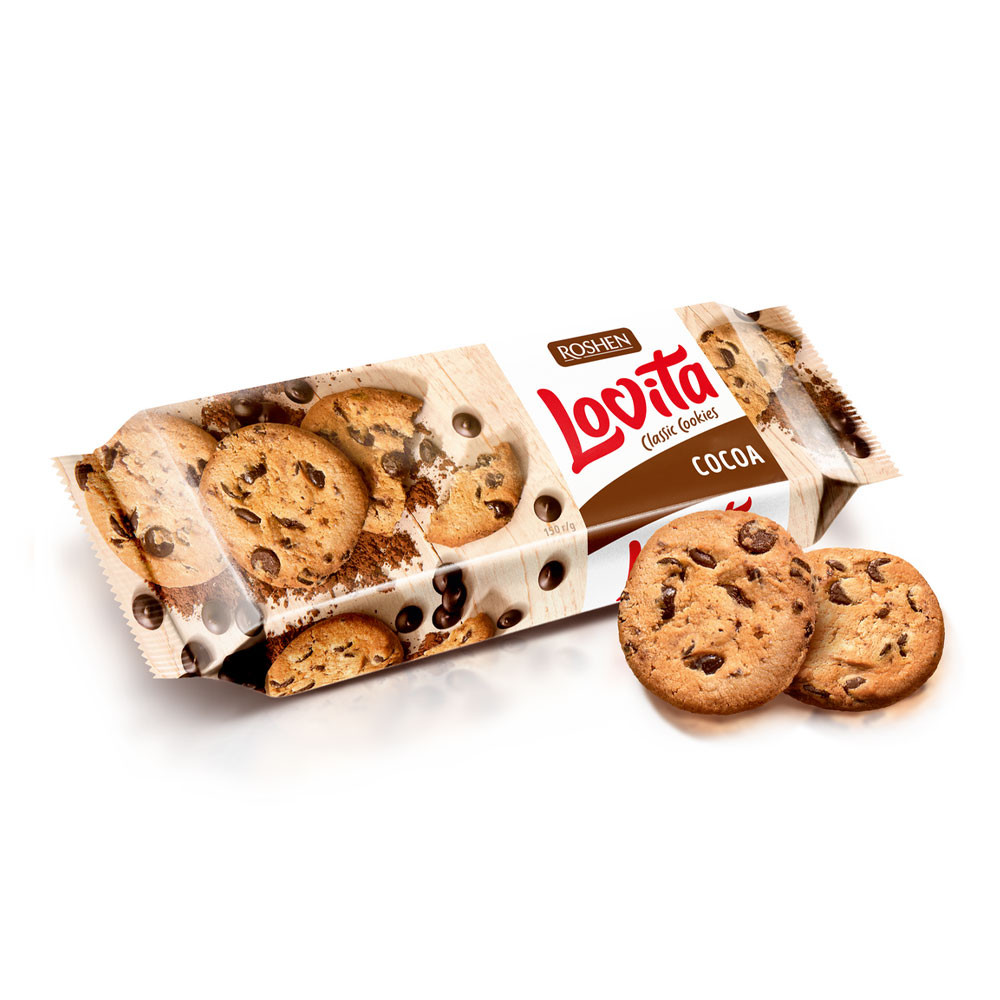 Termék leírás: Roshen Lovita Classic Cookies - Omlós teasütemény csokoládéízű darabkákkal (150g).