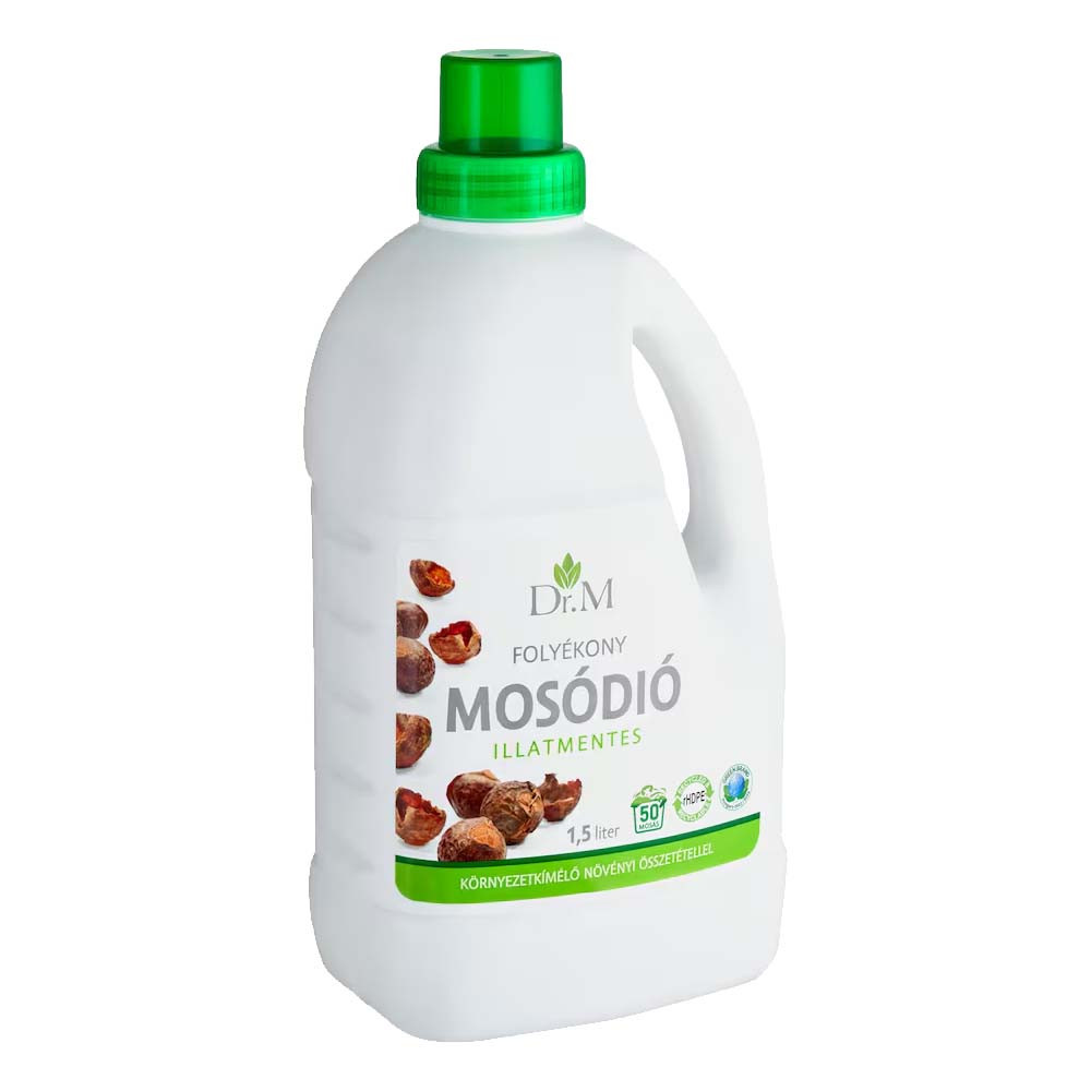 Termék leírás: Dr.M illatmentes folyékony mosódió - környezetkímélő, növényi alapú mosógél színes és fehér ruhákhoz, amely mosódió-kivonatot és enzimeket tartalmaz.