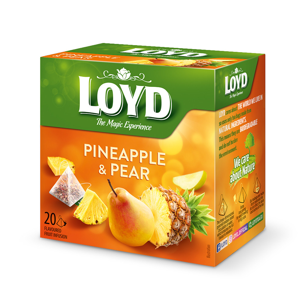 Termék leírás: Loyd körte és ananász ízű gyümölcstea piramis tasakban