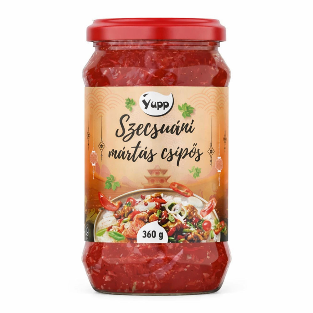 Termék leírás: Yupp szecsuáni csípős mártás. Kínai jellegű, pikáns mártás zöldségekkel és fafülgombával.