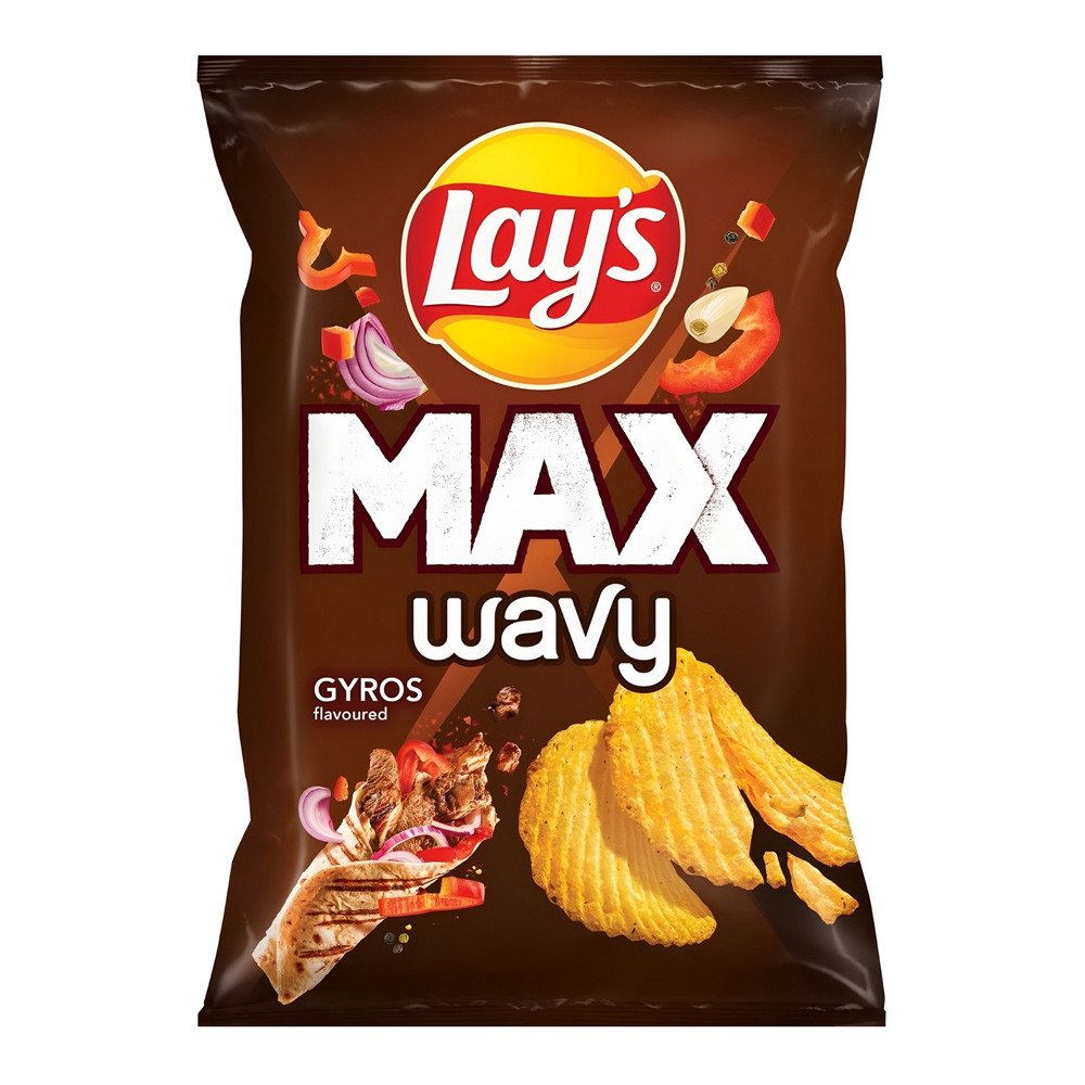 Termék leírás: Lay's chips MAX wavy gyros - 120g, intenzív gyros fűszerezésű, hullámos vágású burgonyachips