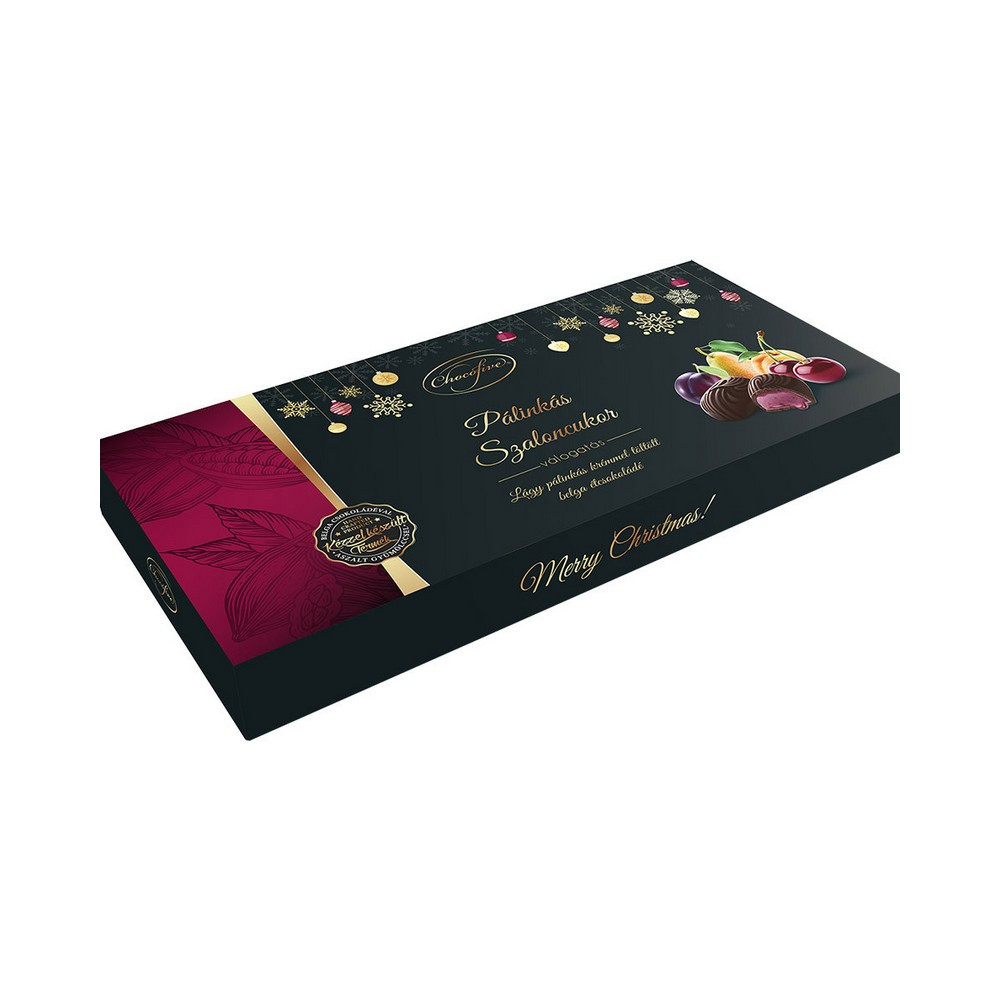 Termék leírás: Valódi pálinkával és aszalt gyümölcsdarabokkal készült prémium szaloncukor válogatás (kajszibarack, vilmoskörte és szatmári szilva ízekben), étcsokoládéval mártva.