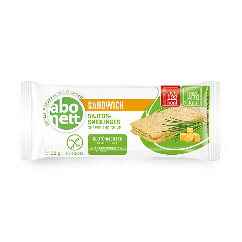 Termék leírás: Abonett Sandwich gluténmentes sajtos-snidlinges szendvics, extrudált kenyér kölessel és krémes töltelékkel.