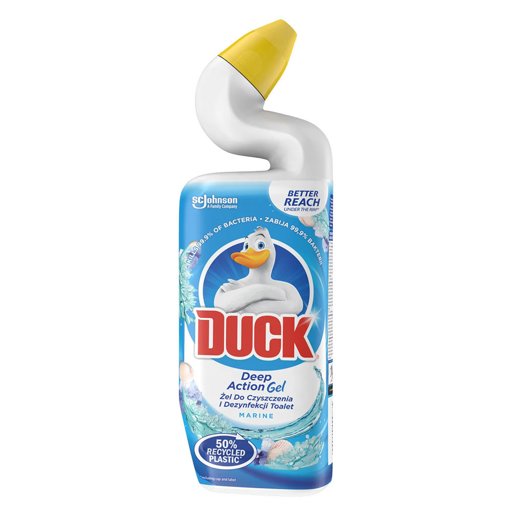 Termék leírás: Duck WC tisztító fertőtlenítő folyadék Deep Action Marine - 750ml. Folyékony tisztító- és fertőtlenítőszer a WC-csészéhez, amely elpusztítja a baktériumok 99,9%-át, eltávolítja a vízkövet és a szennyeződéseket.
