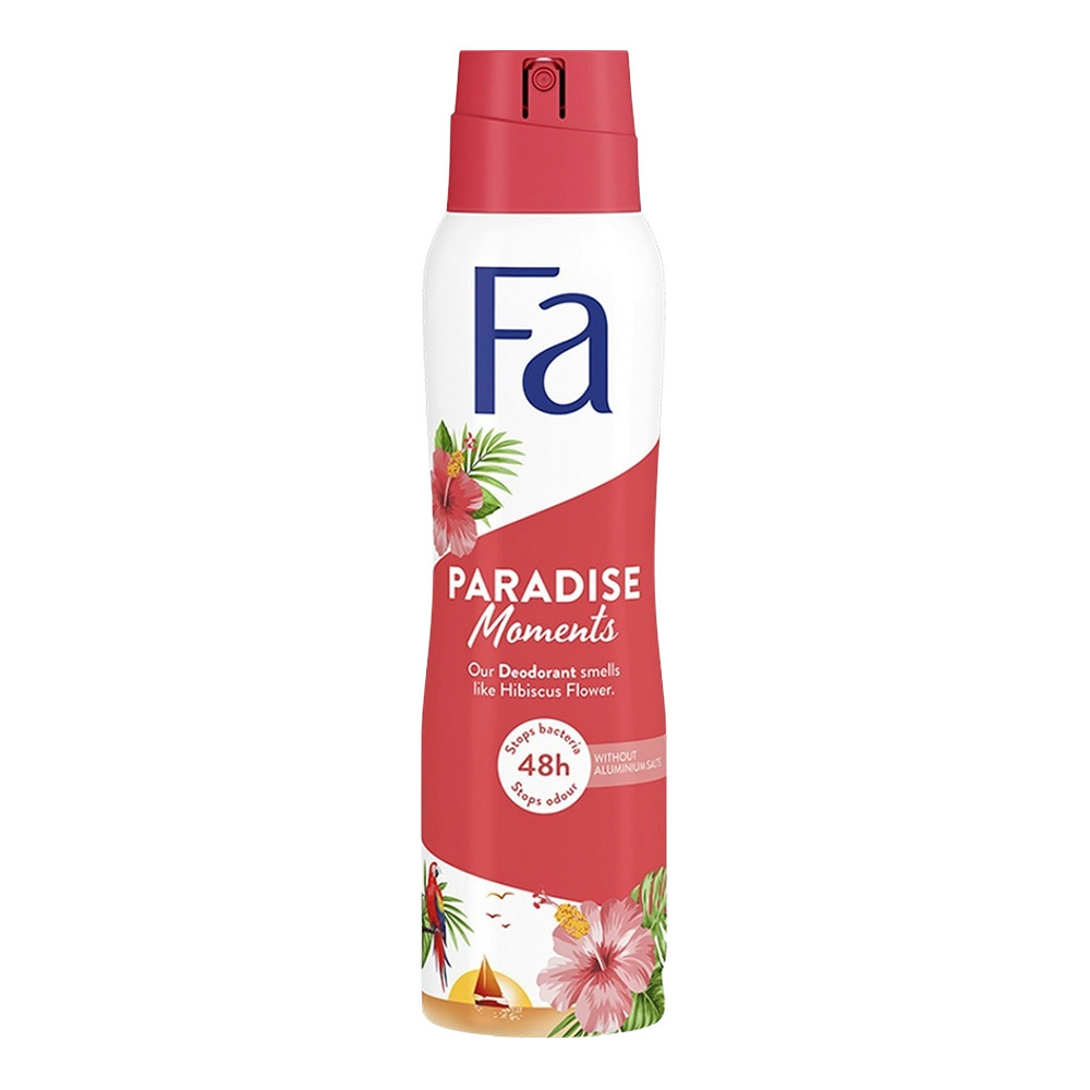 Termék leírás: Fa Paradise Moments hibiszkusz illatú dezodor spray, amely 48 órás védelmet nyújt a testszag ellen, alumíniumsó-mentes és vegán formulával rendelkezik.
