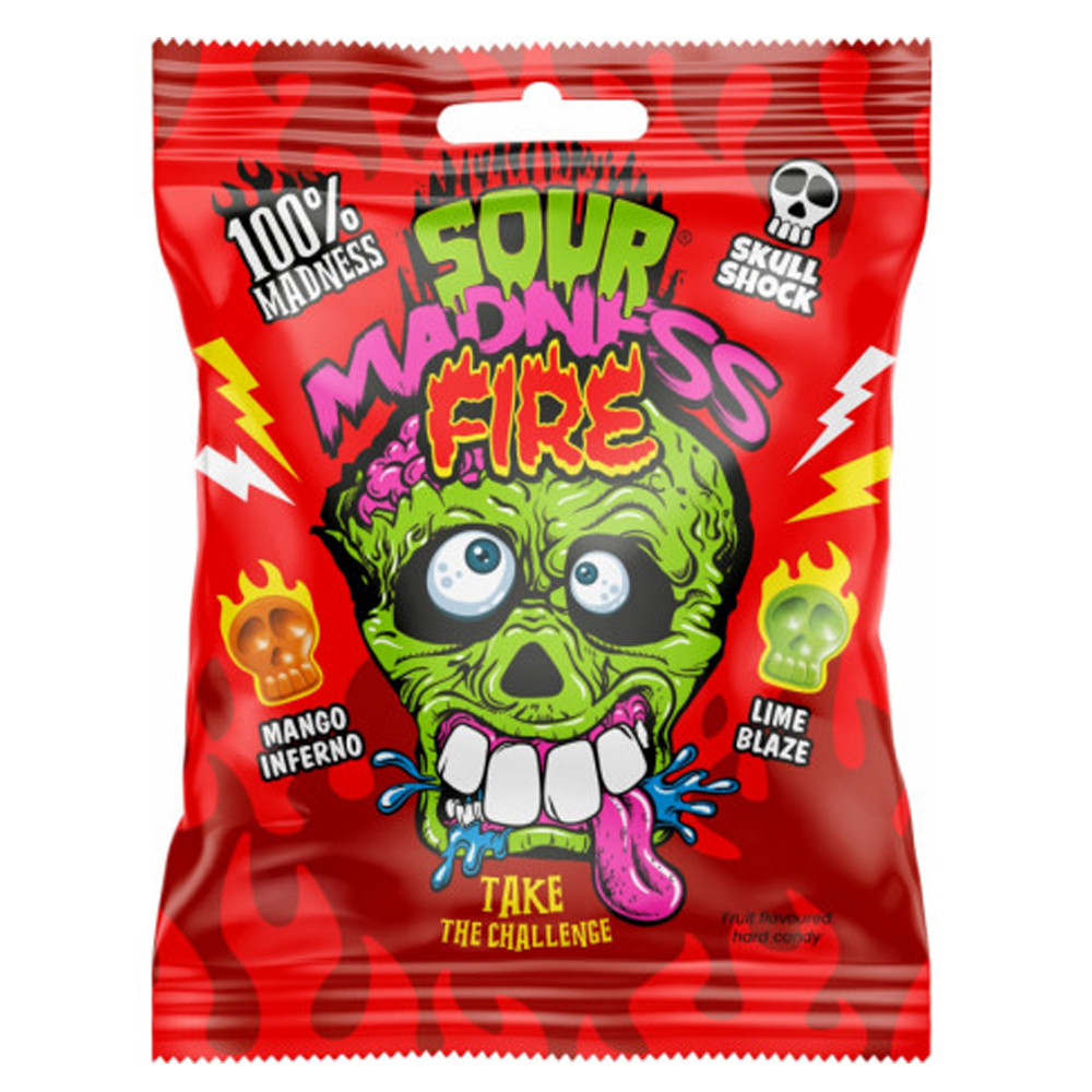 Termék leírás: Extra savanyú, gyümölcs ízű keménycukorka (mangó és lime ízben), melyet 'tüzes' csípősség egészít ki. A cukorkák koponya alakúak.