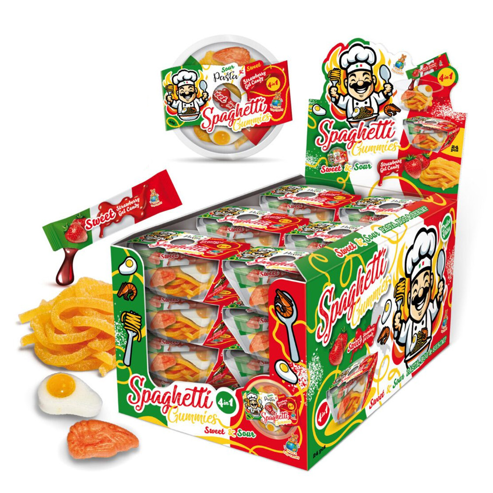 Termék leírás: Spagetti formájú gumicukor eper ízű sziruppal (ketchup) - 46 g