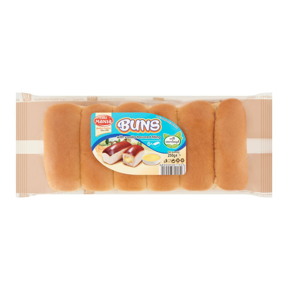 Termék leírás: Cake Mania Buns vanília krémmel töltött molnárka kovásszal 6 db - 250 g